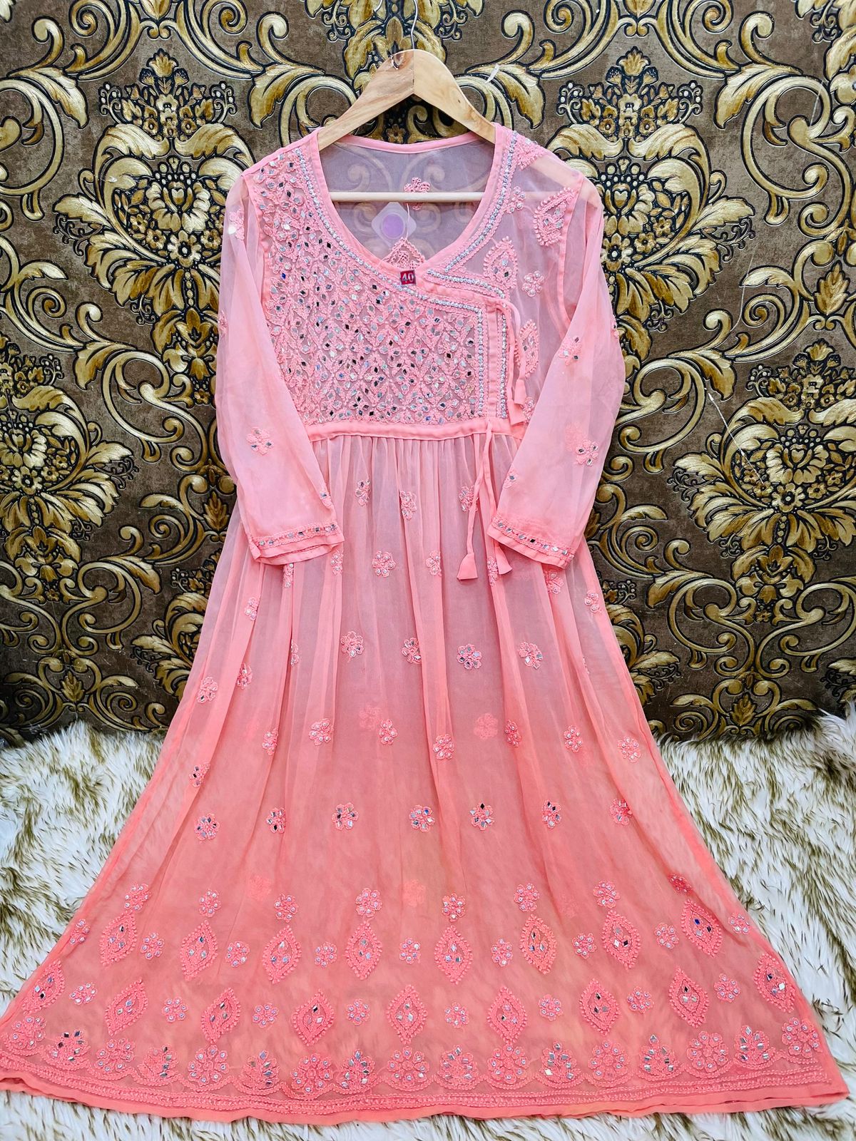 Georgette angrakha gown with beautiful chikankari handwork and mirror work