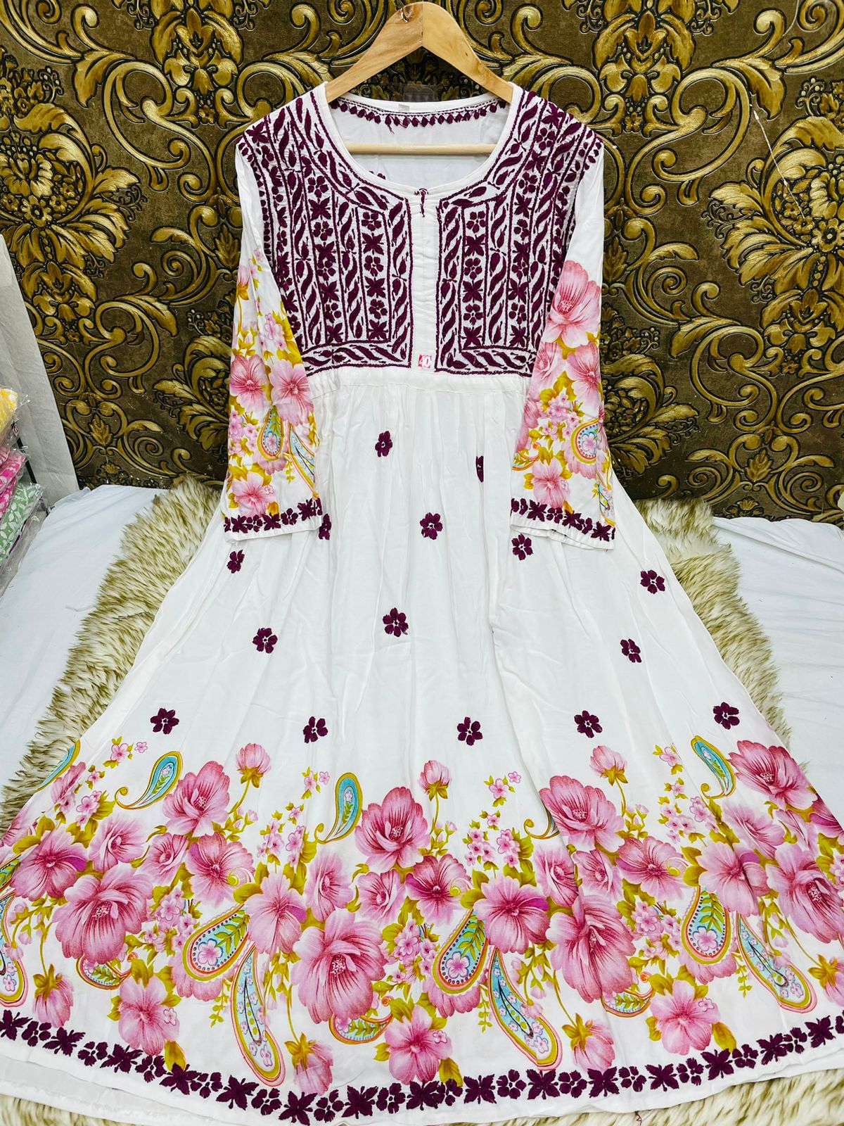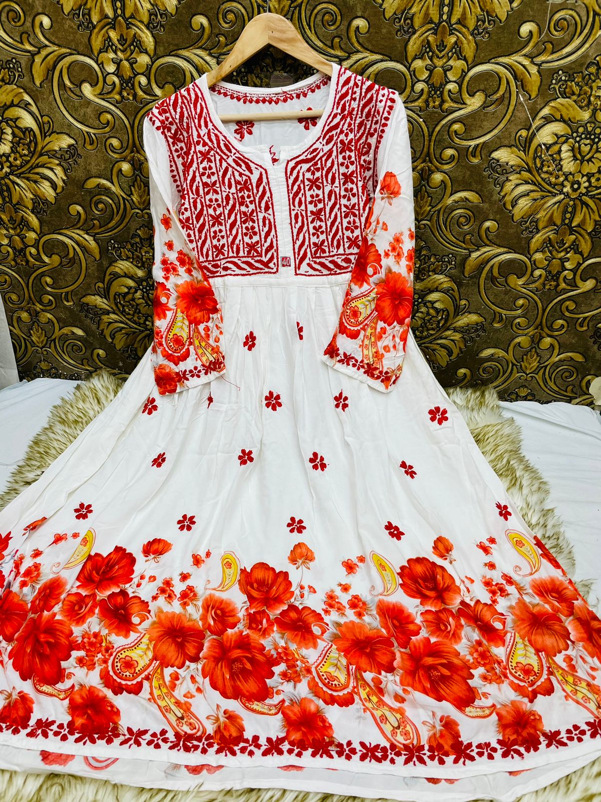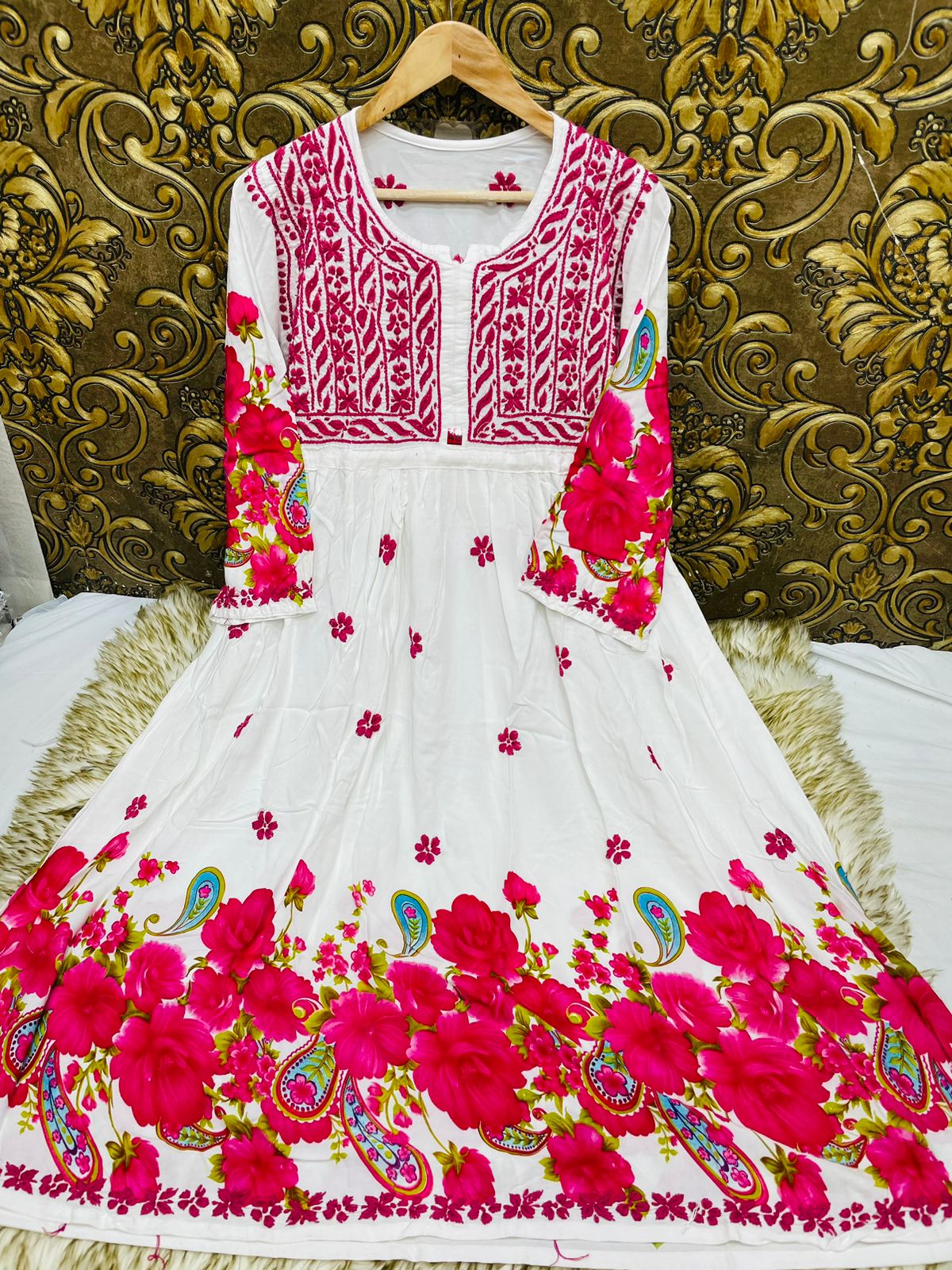 Lucknowi Chikankari Heavy Rayon Border Print Gown